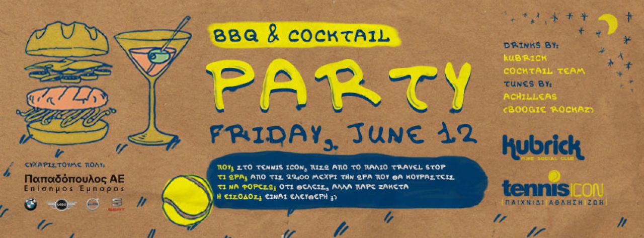 BBQ & COCTAIL PARTY στο tennis ICON την Παρασκευή 12 Ιουνίου στις 22:00! Θα έχει τα σπέσιαλ coctails του KUBRICK, chef που θα ετοιμάζει burgers & hot dogs, μουσικές από τον Αχιλλέα από Boogie Rockaz! Σας περιμένουμε να υποδεχτούμε το καλοκαίρι!